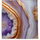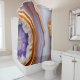 Las cortinas tienen un diseño llamativo que recuerda a una sección transversal de piedra geodésica o agate, con capas de lavanda, azul claro, blanco y oro en los bordes exteriores, pasando a tonos más profundos morados y marrones hacia el centro. El punto central es una vibrante estructura cristalina morada y blanca, rodeada por un borde dorado. El efecto general es visualmente cautivador, dando la impresión de una formación mineral natural.