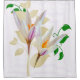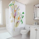 Las obras de arte de esta cortina de ducha presentan delicados elementos florales tipo croco enmarcados por venas beige y viñas verdes, con hojas blancas translúcidas que añaden profundidad y textura a un fondo de líneas concéntricas y cuadradas, creando un elegante contraste.
