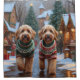 This festive design captures the joyful spirit of the holiday season, featuring an adorable dogs.Nestled in a winter wonderland, complete with a decorated Christmas tree, and beautifully wrapped presents. Snowflakes gently fall, adding a magical touch to the scene, while the vibrant colors of the holiday decorations create a warm and cheerful atmosphere.