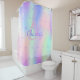 Un fondo holográfico de moda con colores pastel de unicornio y arcoiris en rosa, violeta, oro rosa, verde menta. Personalice y agregue un nombre y sus iniciales de monograma. Escrito con un guión de estilo moderno con letras a mano. Letras de color púrpura y rosa. Las iniciales de su monograma como patrón de fondo.