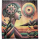 Obra gráfica colorida y abstracta de una mujer adornada con flores, sol y estrellas, con un efecto acuarela y texturas.