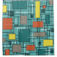 Un diseño de arte geométrico y abstracto moderno de mediados de siglo con líneas, cuadrados y rectángulos de color turquesa, verde azulado, naranja y amarillo.