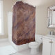 Esta elegante cortina de ducha está decorada con tonos marrones y violetas. El diseño es de arte original.