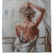 An oil painting capturing a serene moment on a sunlit Mediterranean balcony. A woman in a flowing white wrap stands with her back turned, her hair lifted by a gentle breeze, set against soft architectural details. Ideal for adding timeless elegance to home decor or gifts.
