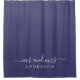 Cortina de ducha con monograma azul marino de moda con el texto Mr. y Mrs. en un elegante y blanco. Puedes personalizar este diseño elegante con tu nombre casado. Un regalo de lujo perfecto para la pareja recién casada. Diseñado exclusivamente para usted por Happy Dolphin Studio.