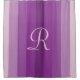 Esta simple cortina de ducha minimalista tiene un fondo de rayas de diferentes tonos de púrpura. La monograma es de color púrpura pálido. Un regalo simple pero elegante de decoración del hogar para una boda o inauguración de casa. Todos los derechos reservados © 2015 Alan & Marcia Socolik.