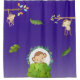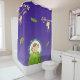 Una cortina de ducha con monos lindos que se balancean de los árboles y una que se asoma por detrás de un arbusto. El diseño de safari es bonito y caprichoso. Se establece en un fondo de degradado púrpura.