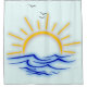 Esta obra de arte representa una variedad de pájaros que parecen flotar sin peso sobre las ráfagas de sol y las neblinas olas azules del océano en un tranquilo y hermoso lienzo azul azure de color cimista, produciendo una atmósfera positiva y de ensueño y dando como resultado una delicada cortina de ducha acentuada.