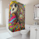 Un opossum de estilo psicodélico blanco y negro sobre un fondo ondulado y colorido.