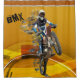 Pintura del jinete del atleta y del truco del motocrós haciendo estallar un wheelie en un paisaje abstracto del desierto. Texto BMX