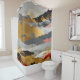 Un tranquilo paisaje de inspiración japonesa con montañas y árboles en capas, acentuados con detalles de oro brillantes. Esta elegante composición combina la estética tradicional con la abstracción moderna.