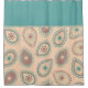 Cortina de ducha Paisley silenciada. Patrón paisley de todo sobre un fondo beige con una verde azulada cinta monocromática de polka punteada en la parte superior.