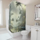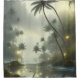Playa costera con palmeras en las cortinas de la ducha y océano con luces brillantes.