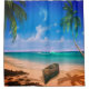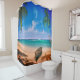 Relájese en el paraíso gracias a esta cortina de ducha de colores vivos. Esta cortina tiene la imagen de una playa tropical con una magnífica arena marrón, palmeras frescas, relajantes olas del océano azul y una hermosa canoa pintada en la orilla.