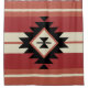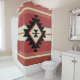 Patrón bohemio étnico azteca con formas geométricas en rojo, naranja, gris y negro sobre fondo rayado