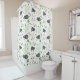 Un gato negro adorable con una cortina de ducha de flores rosadas dispersas sobre un fondo blanco neutro. Visita nuestra tienda para ver nuestros productos de decoración de baño.