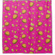 Cortina de ducha con hamburguesas voladoras sobre fondo rosa