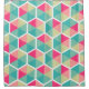 Cortina de ducha con un patrón geométrico compuesto por seis hexágonos laterales divididos por un estrecho espacio blanco dividido en seis segmentos de color en cinco colores armoniosos.