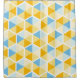 Cortina de ducha con un patrón geométrico compuesto por seis hexágonos laterales divididos por un estrecho espacio blanco dividido en seis segmentos de color en cinco colores armoniosos.
