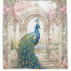 Elegante arte acuático con un hermoso pavo real con arcos indios al fondo con flores rosas.