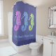 Esta divertida cortina de ducha es perfecta para decorar el baño de su casa de playa y está lista para ser personalizada con el nombre de su casa de playa o cualquier texto que elija. Cuenta con ilustraciones de caballitos de mar de estilo personalizado en color púrpura orquídea, azul claro y verde limón frente a un fondo azul de medianoche.