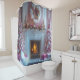 Pretty shower curtain with a lovely, elegant white fireplace adorned with pink candles, white Ostrich feathers, pretty pink and white ornaments and Christmas greenery. Two pink Christmas trees with pink and white ornaments and glowing lights, one on each side of the fireplace,