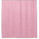 Pink shower curtain with small white polka dots displayed in two images: a close-up showing the pattern, and installed in a modern white bathroom setting.