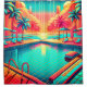 Sumérjase en el encanto vibrante de esta impresionante obra de arte que presenta una escena de piscina tropical con un paisaje urbano. El agua azul claro de la piscina está rodeada por una terraza con baldosas y múltiples tumbonas, lo que crea un ambiente sereno y acogedor. Las palmeras enmarcan el lugar, lo que añade un ambiente tropical. En el fondo, un paisaje urbano con edificios altos se ilumina con un cielo que pasa de cálidos tonos naranjas a frescos tonos azules, lo que sugiere la salida del sol o la puesta de sol. Las franjas verticales de luz descienden del cielo, realzando el ambiente surrealista y retro-futurista del diseño. Perfecto para añadir un toque de elegancia tropical y color a cualquier espacio.