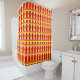 Esta cortina de ducha tiene un diseño art déco, de una manta gruesa y fina de líneas rojas, naranjas y amarillas.