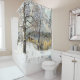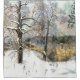 Artista de Zolotareva. acuarela sobre seda - dibujo manual; puente de piedra a través del río en el pueblo. Vista de un puente cubierto de nieve en el bosque.