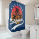 Cortina de ducha de San Diego con un diseño retro que presenta una puesta de sol y palmeras en un fondo azul de Old Glory personalizable. Este diseño también tiene California en una fuente manuscrita con un glifo de cola floreada para ese look retro con estilo. Esta cortina de ducha es solo para ti si eres de San Diego o puedes conseguirla como regalo o recuerdo para alguien.