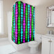 Esta cortina de ducha tiene un diseño moderno de mediados de siglo de rectángulos de neón rosa, verde y azul redondeados en un tamaño creciente y decreciente que corre verticalmente sobre un campo de negro.