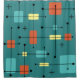 Este diseño moderno inspirado en la era atómica, de mediados de siglo, tiene líneas audaces y formas geométricas en verde azulado, turquesa, amarillo y naranja.