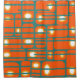 Esta cortina de ducha tiene un diseño moderno de mediados de siglo de rectángulos naranjas con círculos blancos y dorados y líneas horizontales verde azuladas que los atraviesan en un campo de verde azulado.