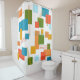 Esta cortina de ducha presenta un diseño moderno de rectángulos y líneas de colores de los años 60.