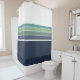 Una cortina de ducha a rayas azul marino, verde azulada y verde retro/mod le da al cuarto de baño un toque divertido de los años 70-80. Sencillo y minimalista, es un pop de color luminoso y relajante que combina bien con muchos estilos de diseño, desde retro a transitorio hasta náutico.