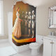 Esta cortina de ducha tiene a una mujer encontrándose con algunos robots retratados en ella.
