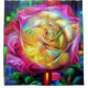 Una fascinante pintura digital de un rosa reventando con energía psicodélica y tonos arcoiris. Los pétalos rosados vivos se envuelven alrededor de un núcleo dorado brillante, creando una pieza central floral surrealista.