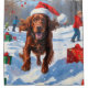 Un bonito Red Setter irlandés recorre alegremente el paisaje nevado, usando un gorra festivo de Navidades rojos. Esta vibrante escena invernal resalta el sedoso abrigo rojo de la raza, el espíritu enérgico y la naturaleza afectuosa mientras se celebra el calor y la magia de la temporada navideña. Un diseño animado y lleno de encanto festivo