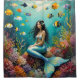 Una hermosa sirena descansa entre coral colorido, rodeada de peces tropicales brillantes, en esta hermosa cortina de ducha de fantasía. Perfecta para cualquiera que ame la fantasía, las sirenas y el mar.