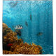 Natación hermosa de los pescados por un arrecife de coral con una escuela de pescados en el fondo.