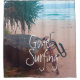 Escenario de playa. "Gone Surfing" es una atractiva escena de playa con una bicicleta y un estante vacío de tablas de surf, "Gone Surfing" Los colores de la playa de azul y arena. Las palabras están en un moderno y divertido tipo de letra en blanco y pueden ser eliminadas o cambiadas si lo desea.