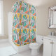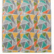 Esta cortina de ducha tiene un diseño moderno de mediados de siglo de triángulos que le dan un aspecto de suelo de terrazo, en gris, turquesa, naranja, dorado y verde.