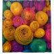 Esta obra de arte abstracta estalla de energía, movimiento y color audaz, atrayendo al espectador a un mundo hipnótico de formas circulares superpuestas. Los espirales entrelazados se ondulan hacia afuera en ricos tonos de oro, carmesí, magenta, azul verdoso y violeta profundo, creando un sentido dinámico de ritmo y profundidad. Cada patrón circular se siente vivo, como un pulso o una órbita, contribuyendo a una composición visual armoniosa pero poderosa.
