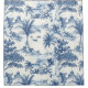 La imagen representa un patrón clásico de tela de Jouy, caracterizado por escenas detalladas en azul sobre un fondo blanco. Cuenta con paisajes tropicales con palmeras exuberantes, terrenos rocosos y cuerpos de agua serenos. Hay elementos como pequeñas cabañas, pájaros en vuelo e islas distantes que le confieren al diseño un ambiente idílico y tranquilo. El patrón es intrincado y evoca una sensación de elegancia tradicional y pastoral a menudo asociada con las artes decorativas francesas.