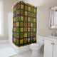 Esta cortina de ducha tiene un diseño de historia negra de círculos, triángulos, diamantes, líneas y zigzags que forman un patrón.
