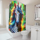 Esta cortina de ducha tiene un unicornio fresco retratado en ella.