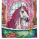 Unicornio de color agua adorable con un mango rosa y violeta empapa en una bañera