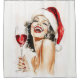 Un impresionante ilustracion acuático de una mujer de estilo vintage clásica adornada con un sombrero de Santa, irradiando alegría mientras ríe mientras sostiene un vaso de vino tinto. Sus glamorosos labios rojos, cabello perfectamente peinado y su elegante conducta encarnan las vacaciones atemporales con un toque de encanto retro.