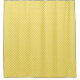Yellow and white geometric-patterned shower curtain in two views: a flat layout and installed in a bright bathroom with white fixtures.